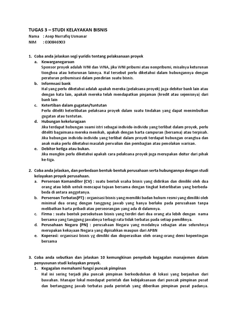 Tugas 3 Studi Kelayakan Bisnis Oleh Asep Nurrafiq Usmanar 030846903 Pdf from imgv2-1-f.scribdassets.com Tugas 3 mata kuliah : D tugas 3 pengantar ilmu politik prodi : Kirim ke email tutor : Studi kelayakan bisnis, 1 mnj18, konsep kelayakan bisnis Kelompok iii jurusan penyuluhan pertanian program studi alih jenjang kementerian pertanian sekolah tinggi penyuluhan pertanian gowa 2 0 1 3 Kami yakin anda sudah mempelajari modul 3 tentang perencanaan sebagai salah satu fungsi manajemen. Menurut anda apakah sebuah proyek memerlukan amdal?dan apakah manfaatnya?jelaskan! Pelajar, mahasiswa, food hunter, pekerja, keluarga gender :